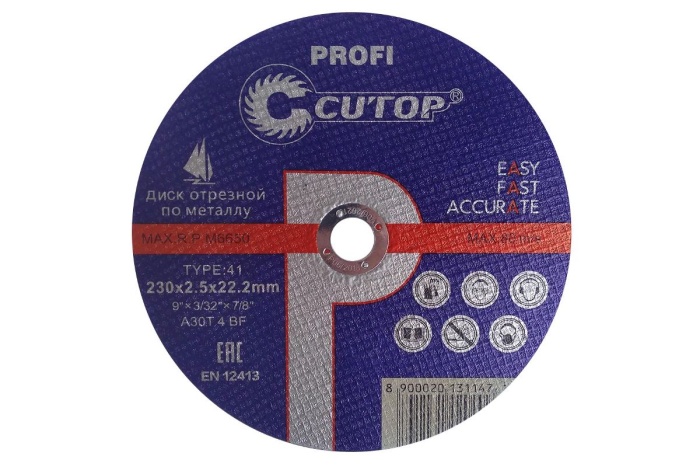 Диск отрезной по металлу из серии Profi торговой марки CUTOP 39984т с параметрами Т41-230х2,5х22,2 мм применяют в домашних условиях, на производстве. Изделием, установленным на УШМ, режут элементы конструкций из нержавеющей и других видов стали, сплавов. Материал изготовления этого вида продукции CUTOP не поддается коррозии, обладает высокой прочностью, долговечностью. Параметры расшифровывают (мм): внутренний диаметр — 22,2, внешний Ø — 230, толщина — 2,5. За счет боразона, сходного свойствами с алмазом, при длительной эксплуатации производительность не падает.